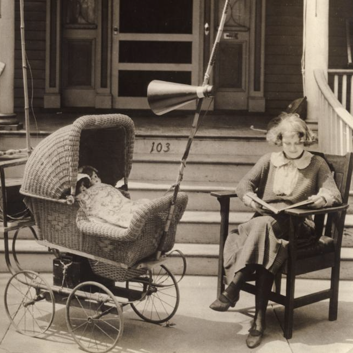 images above (left to right): children at Vero Beach, 1930, State Library Archives of Florida; pram with radio, United States, 1921, Nationaal Archief; uniformed letter carrier with child in mailbag, 1900, National Postal Museum.