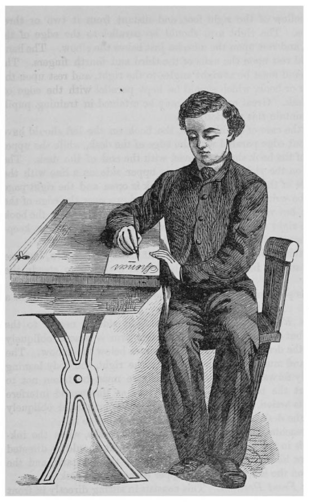 A boy sitting properly at his desk, from the Spencerian Key to Practical Penmanship, 1866.