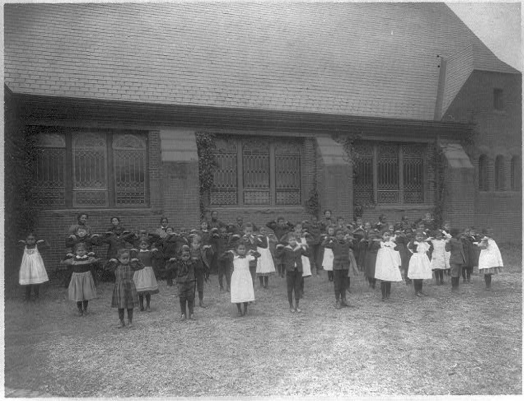 African American and Asian children practice calisthenics at a practice school at Howard University in Washington, DC, (1899?), courtesy of the Library of Congress
